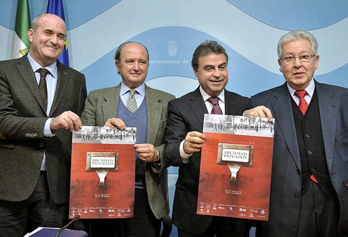 El delegado de Turismo, Cultura y Fiestas, Antonio Real, el secretario de la Real Academia San Dionisio, Andrés Cañadas, el presidente de la Fundación González Byass, Miguel Rebuelta y el coordinador de las jornadas, Manuel Antonio Barea, han presentado hoy las II Jornadas de Archivos Privados que se desarrollarán en Jerez del 11 al 15 de marzo. La sede principal de las jornadas será la Academia de San Dionisio, estando prevista la inauguración en el Alcázar y la clausura en la bodega de González Byass.