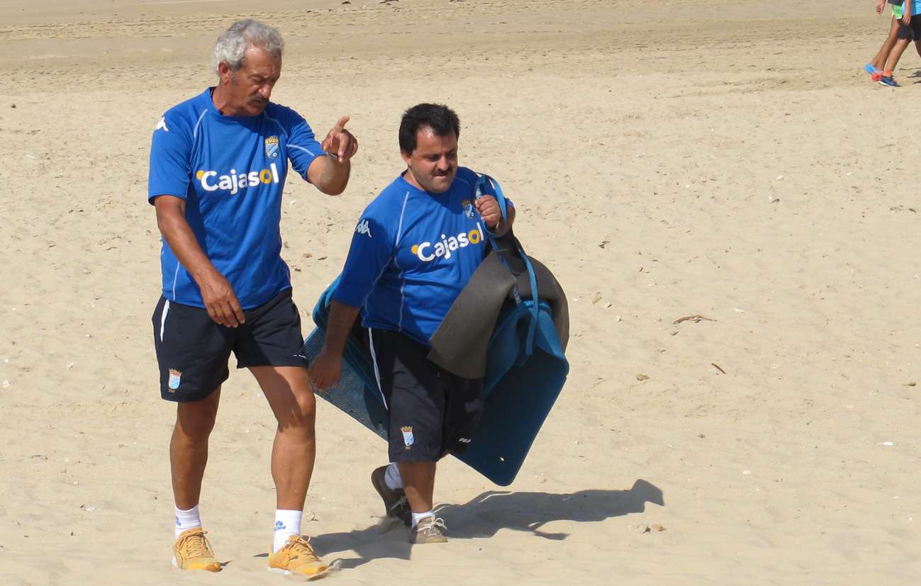 Finalmente son 22 jugadores los que han trabajado, sobre todo el apartado físico con Pepe Losada, que ha imprimido mucha intensidad a los ejercicios. Los elegidos, muchos de ellos a prueba, han realizado primero un circuito con muchas caras de cansancio. Solo Hugo ha sido fichado esta temporada y precisamente uno de los que más intensidad mete en los ejercicios. Posteriormente han jugado al rugby sobre la arena de la playa de Cortadura y el primer entrenamiento ha finalizado sobre las 11.20 horas con varios ejercicios en el agua.