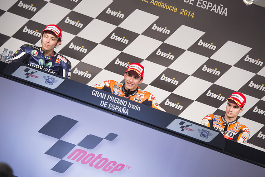 Jerez de la Frontera, Spain, 04 may , 2014: Motogp riders Marc Marquez, Valentino Rossi and Dani Pedrosa in press conference during GRAN PREMIO bwin DE ESPAÑA, in the Jerez circuit.