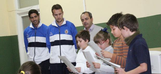 El Xerez Deportivo FC acudía al colegio Andrés Ribera para realizar la actividad ‘Deportes y Educación en Valores’ que organiza el Área Social de la entidad azulina. En esta ocasión la expedición xerecista la conformaban los futbolistas César y Borja Perea, el miembro de la Junta Directiva, Juan Carlos Corchado así como Raúl Zarzuela y Fran Ruiz representando al Área Social.