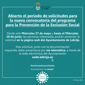 El Ayuntamiento de Lebrija, a través de la Delegación de Bienestar Social, informa que está abierto el plazo de recogida de solicitudes y documentación para la convocatoria del nuevo “Programa para la Prevención de la Exclusión Social”, que cuenta con un presupuesto total de 154.536, 65 euros, cofinanciado al 80% por la Diputación de Sevilla y al 20% por el Ayuntamiento de Lebrija.