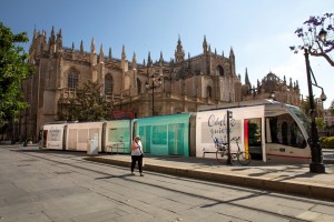 La línea 1 del tranvía, de momento la única en funcionamiento, va desde San Bernardo a la Plaza Nueva, pasando por el Prado de San Sebastián, la Puerta de Jerez, el Archivo de Indias, la Catedral y la Giralda, los lugares más visitados y con más tráfico de turistas de la capital andaluza.