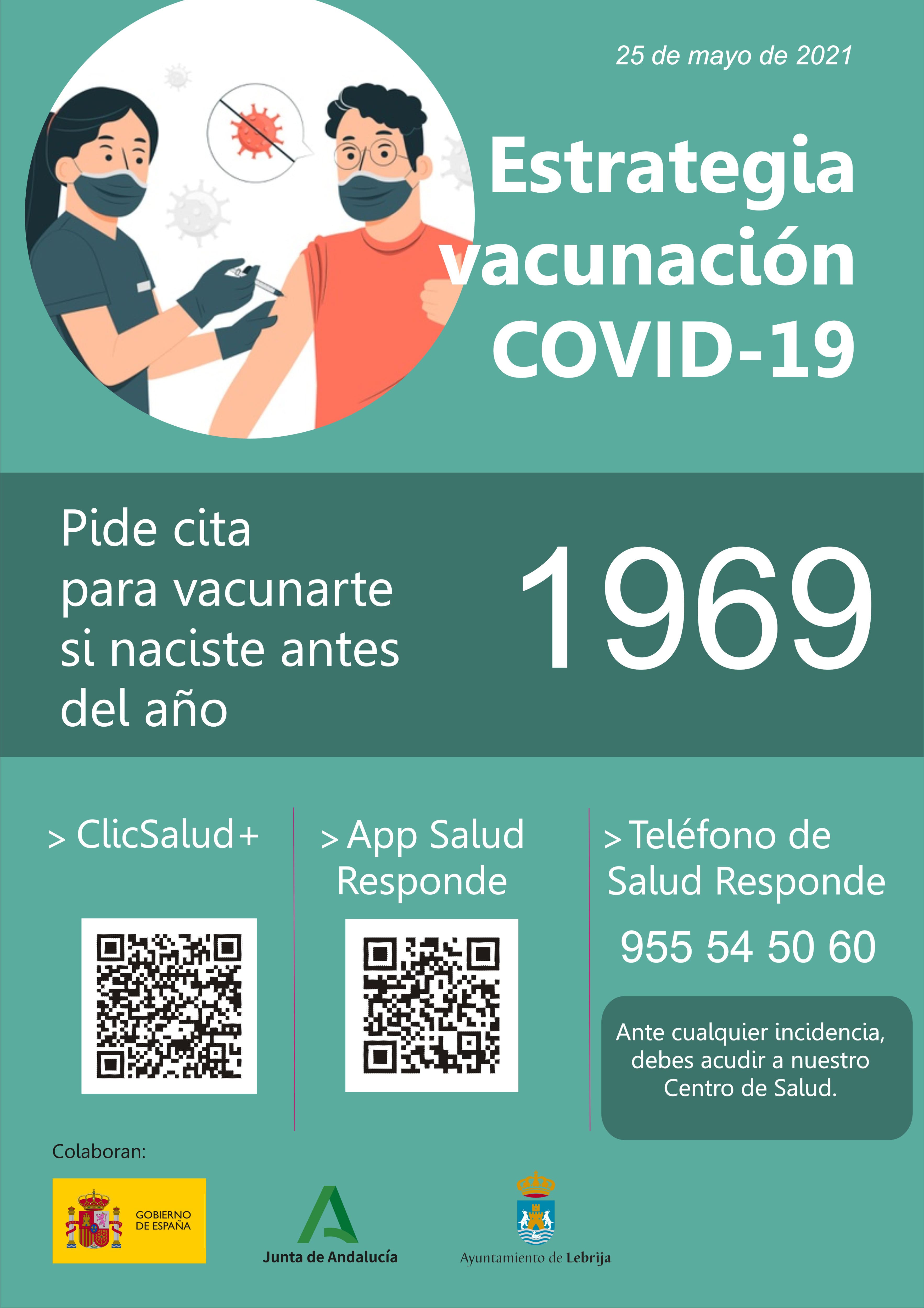 Desde este martes, 25 de mayo, las personas nacidas en los años 1968 y 1969 pueden pedir cita para participar en el proceso de vacunación establecido para frenar la propagación de la Covid-19. En Lebrija este grupo poblacional asciende a 946 personas que, de forma autónoma, podrán reservar cita para participar en la estrategia de vacunación.