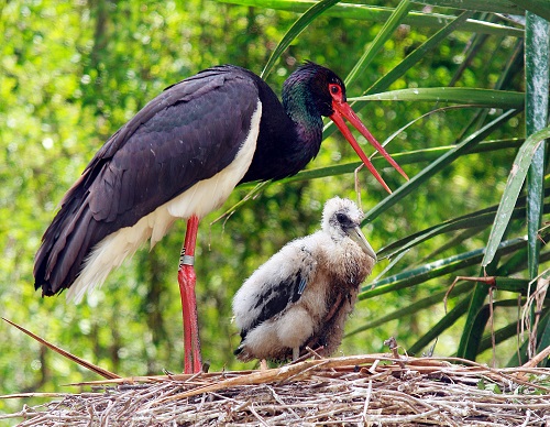 Los cuatro pollos de cigüeñas negras han crecido mucho y van cambiando poco a poco su plumaje. Se encuentran en la gran pajarera, junto a las cebras. En la zona frente a las cebras, las palomas de Nicobar están echadas en sus nidos. El impresionante pavón de monte también ha puesto huevos, lo podemos ver en la pajarera, frente al jardín de sicas, plantas que no han evolucionado y podemos disfrutarlas de la misma forma que lo hicieron los grandes dinosaurios.
