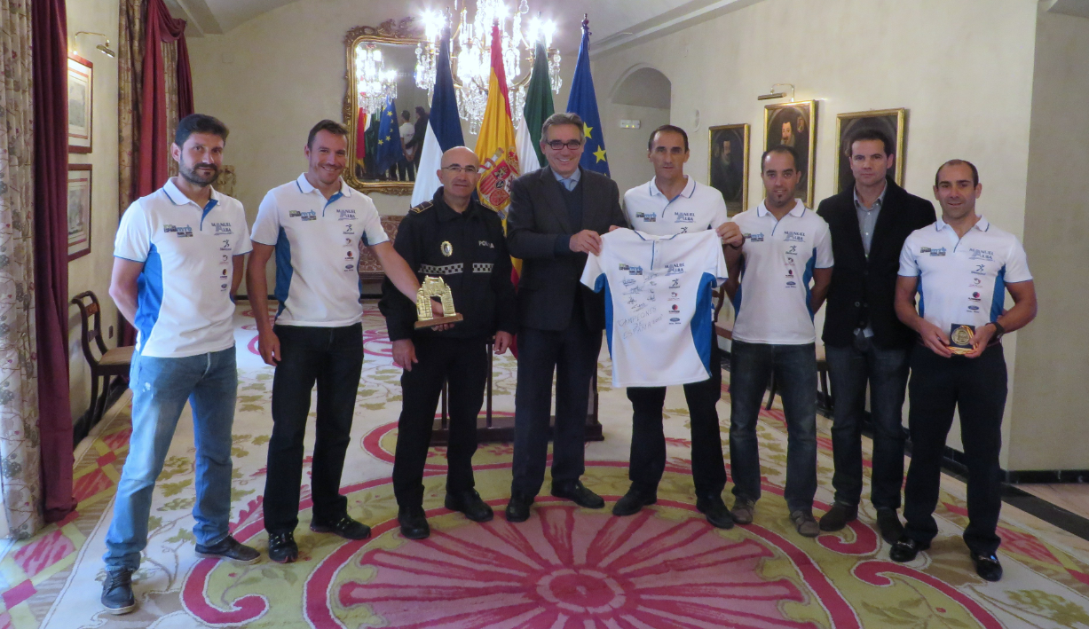 El segundo teniente de alcalde y delegado de Personal y Seguridad, Javier Durá, recibió acompañado por el jefe de la Policía Local, Manuel Cabrales, en el Salón Noble del Ayuntamiento, a los componentes del equipo de Mountain-Bike de la Asociación Deportiva Sherrypol de la Policía Local, encabezados por su presidente, Francisco J. Medina, y que proclamó Campeón de España por equipos en el XVI Nacional de Mountain-Bike desarrollado el último fin de semana del pasado mes de septiembre. Los miembros del equipo han regalado una camiseta de competición firmada a la alcaldesa.