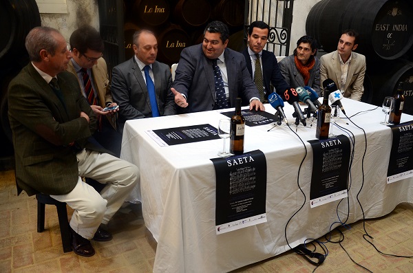 El concejal responsable del Plan Especial de Promociones Culturales, Antonio Montero, acompañado por el presidente de la Unión de Hermandades, Pedro Pérez, el presidente de la Peña Buena Gente, Nico Sosa, el hermano mayor del Desconsuelo, Ángel Bocarando, el Relaciones Públicas de bodegas Lustau, Juan Mateos, el cantaor jerezano, Antonio Agujetas, y el exaltador, Antonio Gallardo Monje, ha presentado la XXVI Exaltación de la Saeta, dedicada a Antonio Gallardo Molina, en la Bodega Lustau. La Peña La Buena Gente organiza el evento, que tendrá lugar este viernes, 14 de marzo, a partir de las 21.30 horas, en la iglesia de San Mateo.